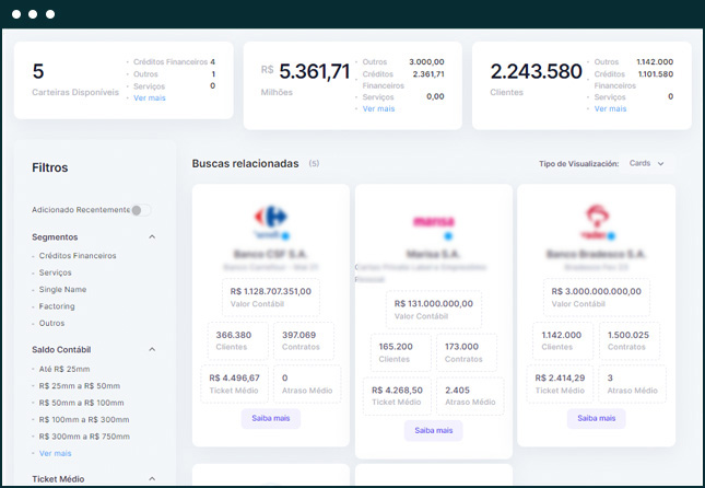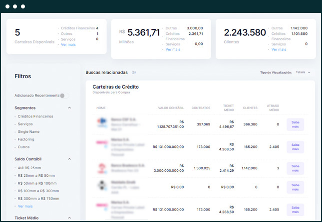 Nossa Plataforma permite vender carteiras de créditos performing e non-performing de diversos segmentos, como financeiro, varejo, imobiliário, saúde, utilities, Corporate, educação, etc., administrando todo ciclo de venda, desde a análise até o fechamento da operação.